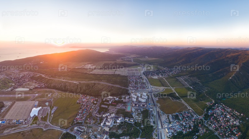Геленджик, Россия. Панорамный вид на город и залив. Летний закат. С высоты птичьего полета