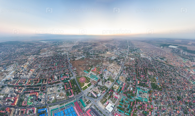 Грозный, Россия. Панорама города с воздуха после захода солнца. Синий час. С высоты птичьего полета