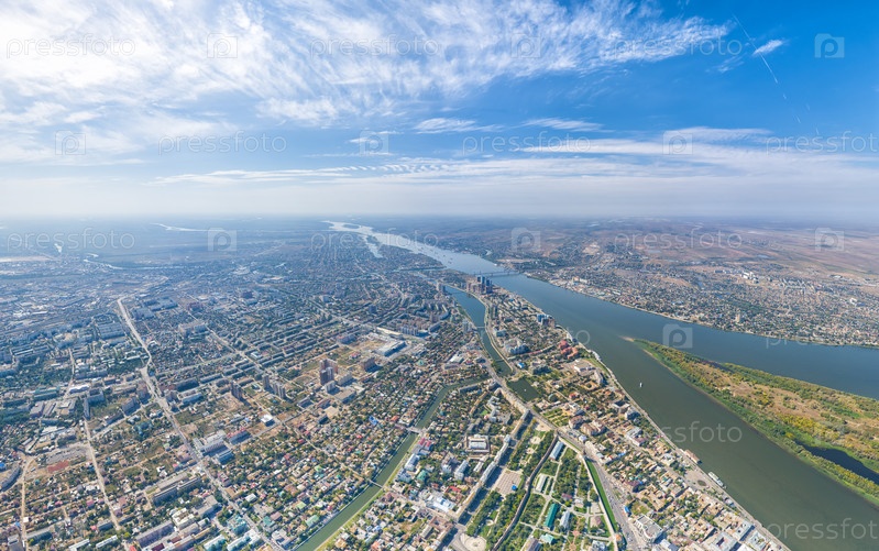Астрахань, Россия. Панорама города с воздуха летом. Река Волга и остров Городстой. С высоты птичьего полета