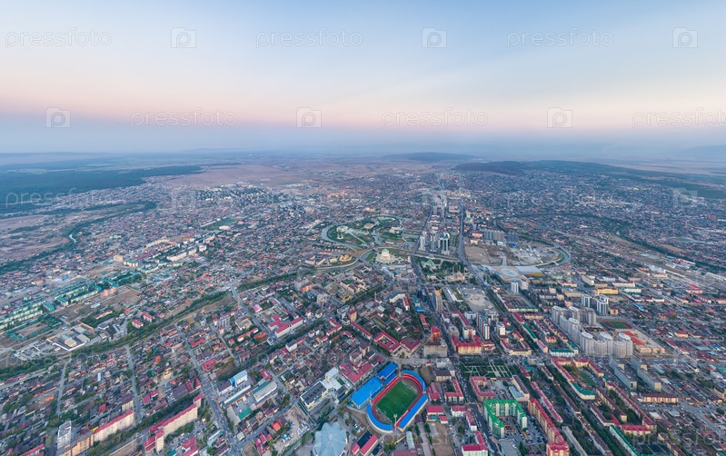 Грозный, Россия. Панорама города с воздуха после захода солнца. Синий час. С высоты птичьего полета