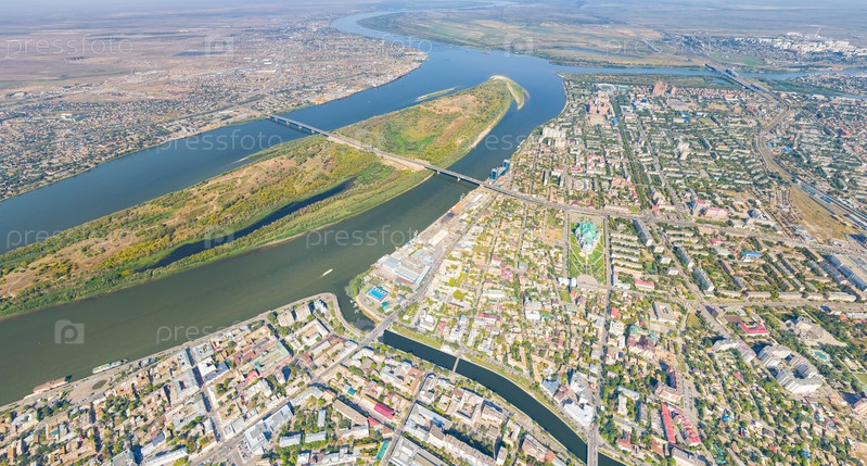 Астрахань, Россия. Панорама города с воздуха летом. Река Волга и остров Городстой. С высоты птичьего полета