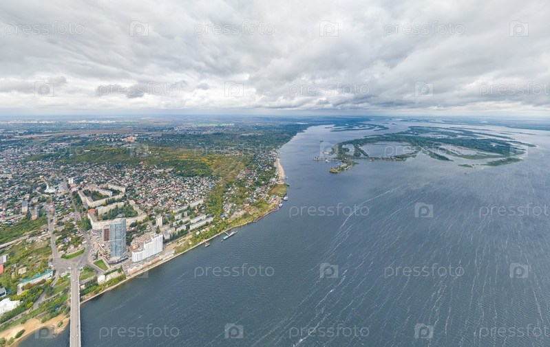 Саратов, Россия. Панорама города и Саратовского моста через Волгу. Облачная погода. С высоты птичьего полета