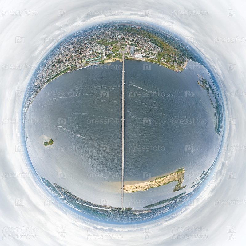 Саратов, Россия. Панорама города и Саратовского моста через Волгу. Мост соединяет Саратов и Энгельс. 360-градусный воздушный панорамный астероид