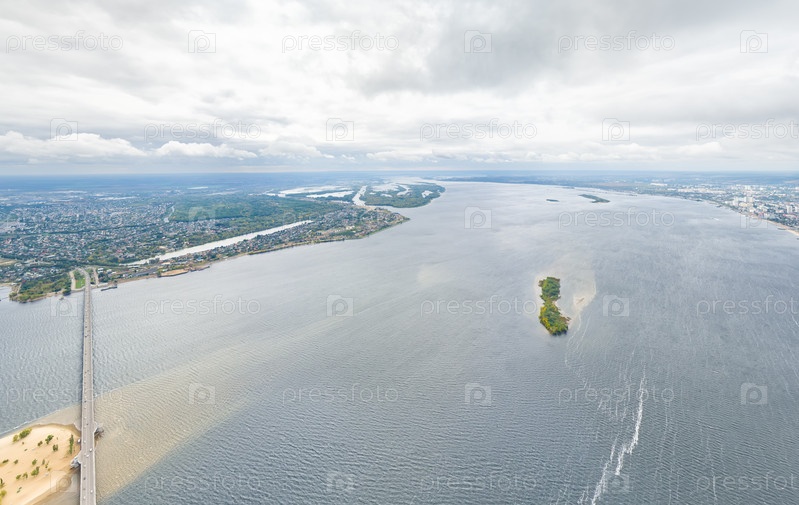 Саратов, Россия. Панорама города и Саратовского моста через Волгу. Облачная погода. С высоты птичьего полета