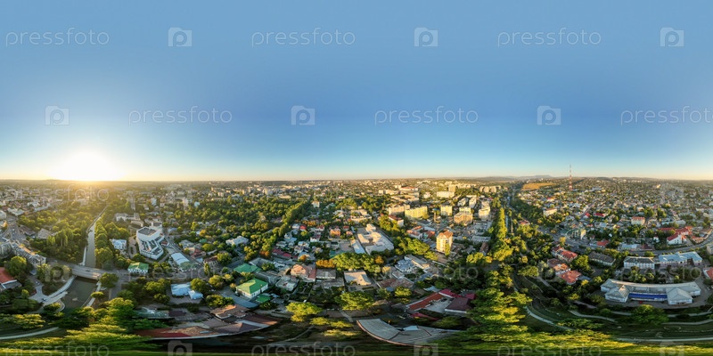 Симферополь, Крым. Город в центре Крымского полуострова, на реке Салгир. Панорама 360 с воздуха во время заката. Лето
