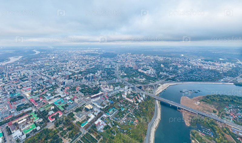 Уфа, Россия. Панорама города с воздуха во время заката. Облачная погода. С высоты птичьего полета
