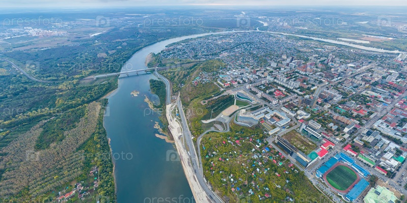 Уфа, Россия. Панорама города с воздуха во время заката. Облачная погода. С высоты птичьего полета