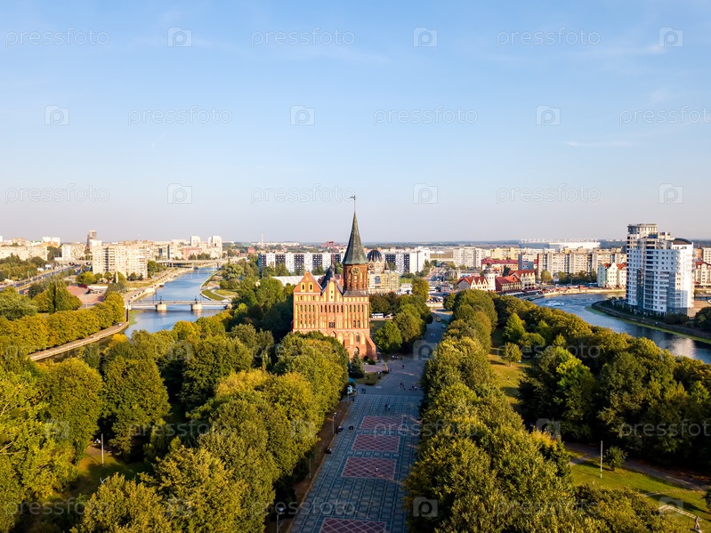 Вид с воздуха Центральная часть города Калининграда, Калининградский собор на острове Канта. Россия