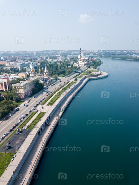 Россия, Иркутск. Центральная набережная города. Река Ангара. Аэрофотоснимок