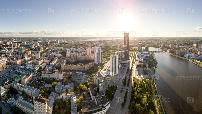 Панорама на закате. Центр города Екатеринбурга. Россия. Аэрофотосъемка