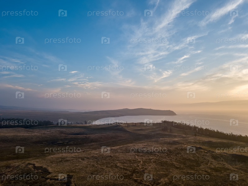 Заходящее солнце над заливом Малого моря Байкал. Россия, остров Ольхон. Снято с дрона