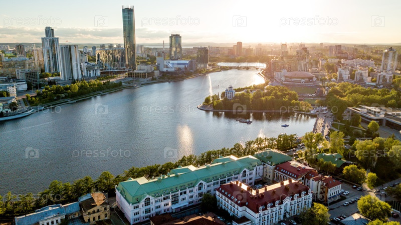 Центральный пруд города. Вид на небоскребы. Закат. Вид с воздуха (дрон). Екатеринбург, Россия
