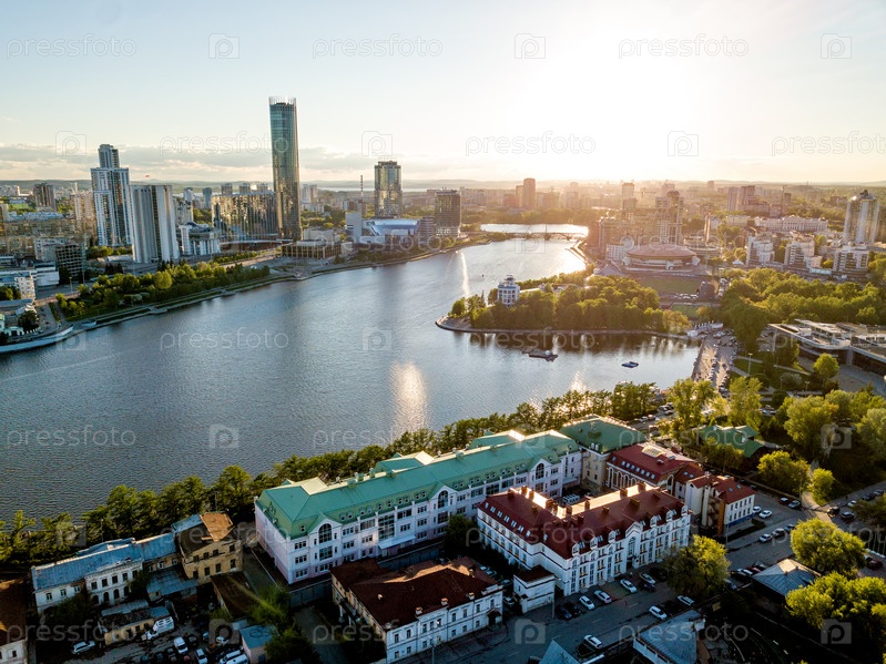 Центральный пруд города. Вид на небоскребы. Закат. Вид с воздуха (дрон). Екатеринбург, Россия
