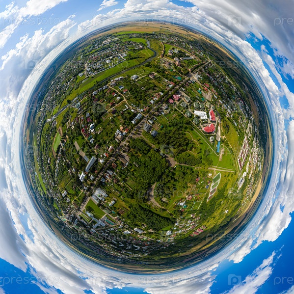 Суздаль, Россия. Панорама летнего города. С высоты птичьего полета. 360-градусный панорамный астероид
