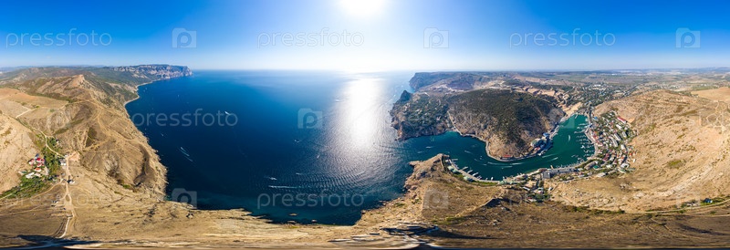 Севастополь, Крым. Балаклавская бухта с яхтами и прогулочными катерами. Панорама 360. Вид с воздуха