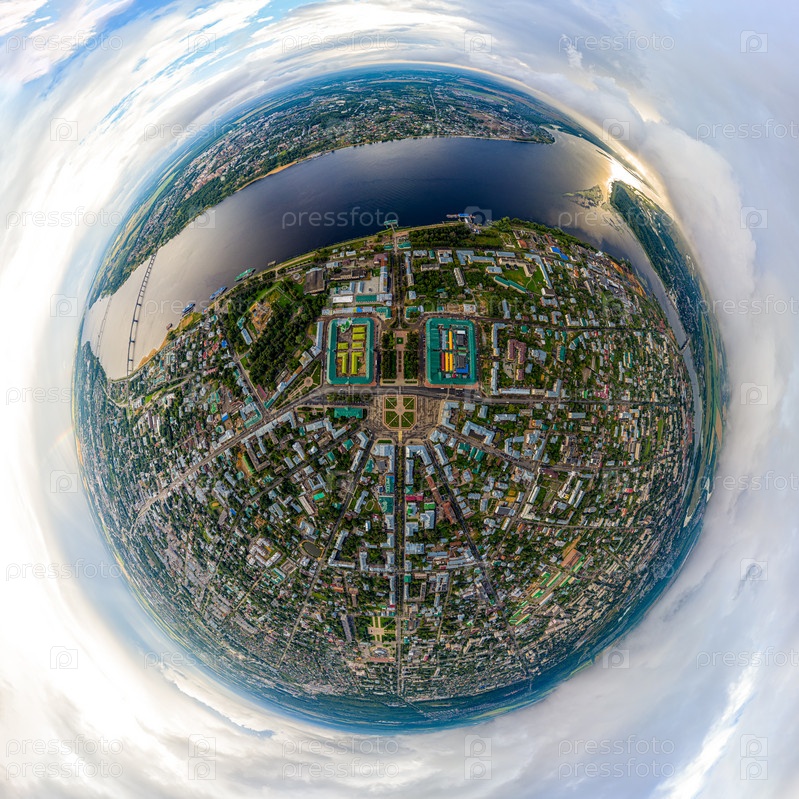Кострома, Россия. Набережная реки Волги, Панорама центра города. С высоты птичьего полета. 360-градусный панорамный астероид