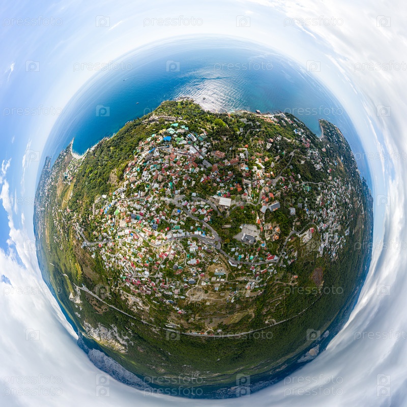 Алупка. Крым. Деревни на берегу Черного моря в свете яркого солнца. Алупка. 360-градусный панорамный астероид