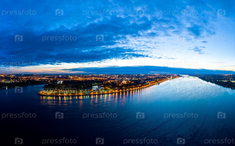 Ярославль, Россия. Панорамный вид на парк «Стрелка». Набережная реки Волги, впадение в реку Которосль. Вид с воздуха ночью