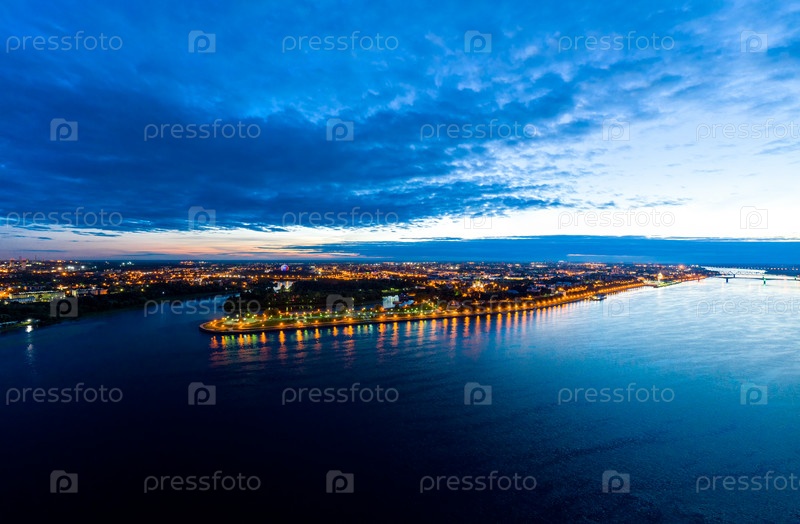 Ярославль, Россия. Панорамный вид на парк «Стрелка». Набережная реки Волги, впадение в реку Которосль. Вид с воздуха ночью