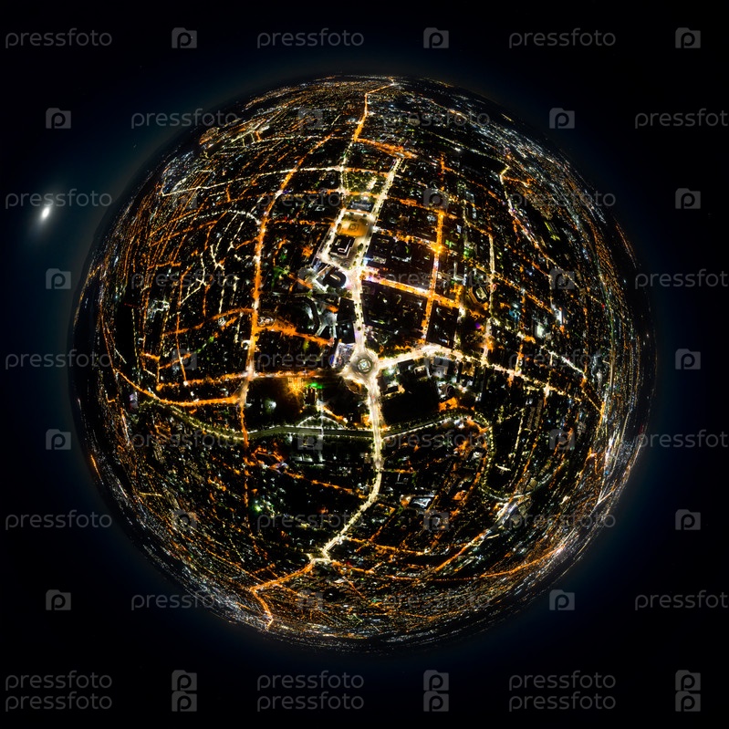Симферополь, Крым. Огни ночного города. Вид на город Ночью с высоты. 360-градусный панорамный астероид