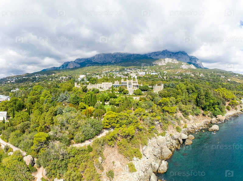 Алупка. Крым. Воронцовский дворец в свете яркого солнца. Лето. С высоты птичьего полета