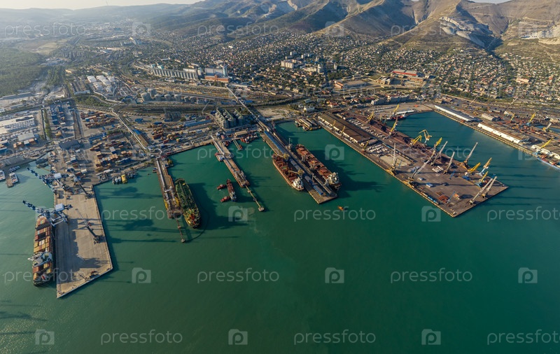 Новороссийск, Россия. Центральная часть города. Порт в Новороссийской бухте. С высоты птичьего полета