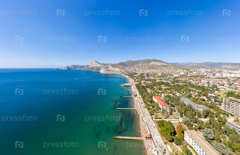 Судак, Крым. Генуэзская крепость. Вид на городские пляжи Судака со стороны Черного моря. С высоты птичьего полета