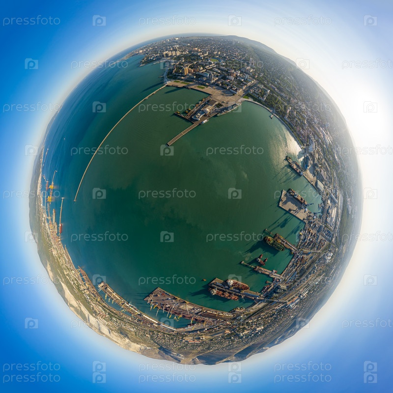 Новороссийск, Россия. Центральная часть города. Порт в Новороссийской бухте. 360-градусный панорамный астероид