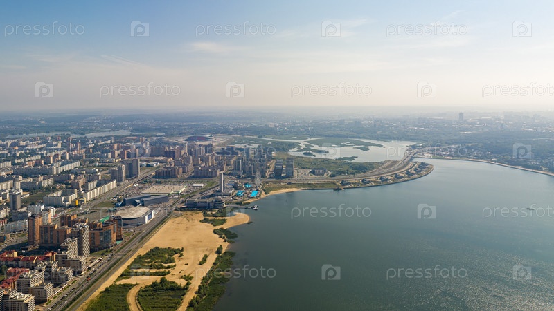 Казань, Россия. Вид с воздуха на центральные районы Казани. Полет над рекой Казанка. Панорама