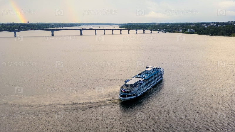 Кострома, Россия. Полет над Волгой. Круизный лайнер отходит от пирса, Радуга, вид с воздуха