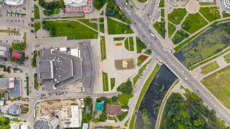 Иваново, Россия. Полет над центром города. Набережная реки Уводь, вид с воздуха, СНИМОК ГОЛОВЫ