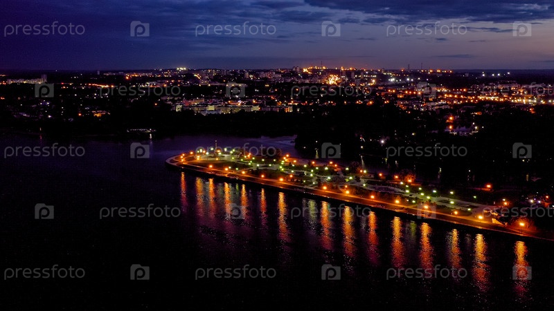 Ярославль, Россия. Стрелка, Которосль впадает в реку Волгу. Огни города после захода солнца, сумерки, вид с воздуха