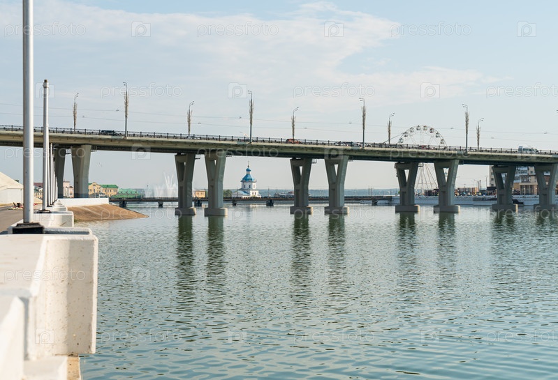 Чебоксары, Россия. Набережная Чебоксарского залива. Московский мост. Церковь Успения Пресвятой Богородицы