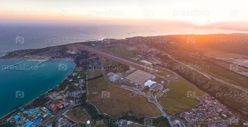 Геленджик, Россия. Панорамный вид на город и залив. Летний закат. С высоты птичьего полета