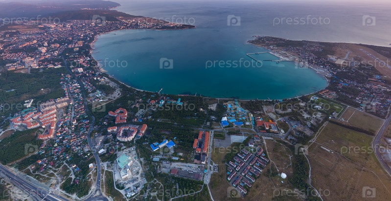 Геленджик, Россия. Панорамный вид на город и залив. Летний закат. С высоты птичьего полета