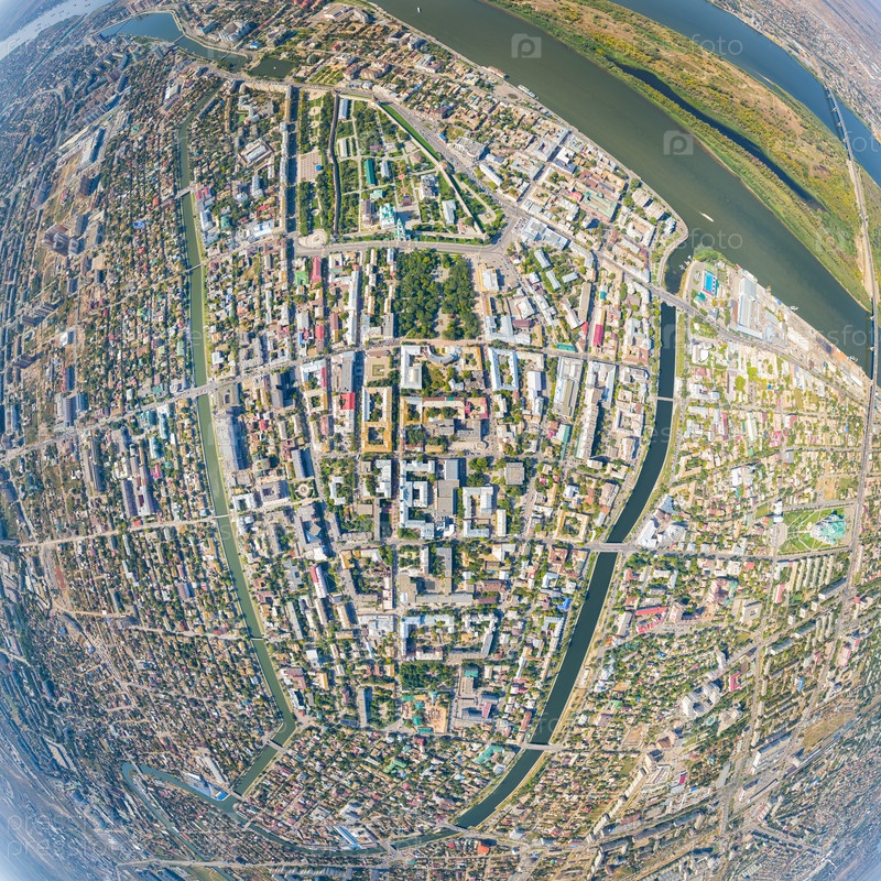 Астрахань, Россия. Панорама города с воздуха летом. Река Волга и остров Городстой. С высоты птичьего полета