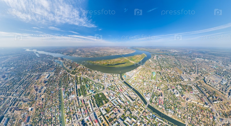Астрахань, Россия. Панорама города с воздуха летом. Река Волга и остров Городстой. С высоты птичьего полета