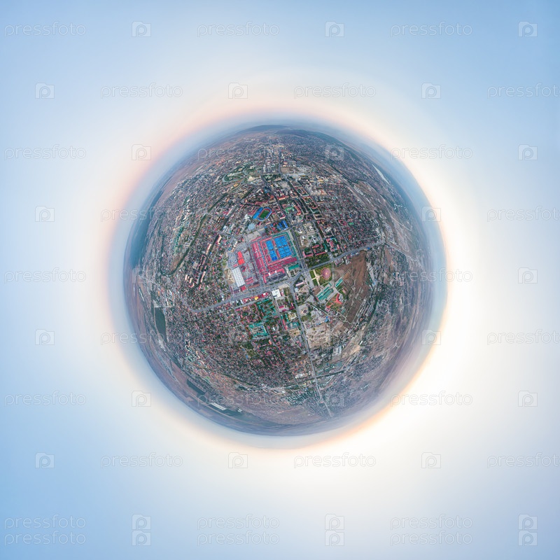 Грозный, Россия. Панорама города с воздуха после захода солнца. Синий час. 360-градусный воздушный панорамный астероид