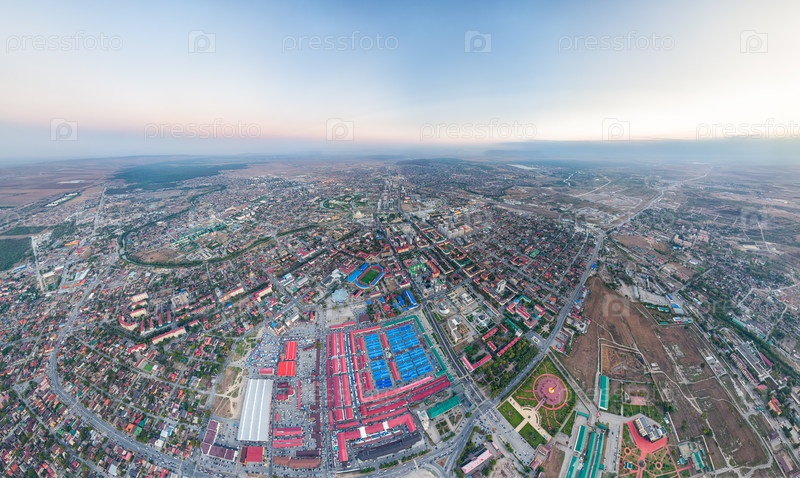 Грозный, Россия. Панорама города с воздуха после захода солнца. Синий час. С высоты птичьего полета