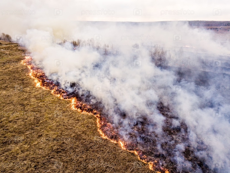Большой пожар. Горит сухая трава. много дыма. С высоты птичьего полета. Екатеринбург, Россия