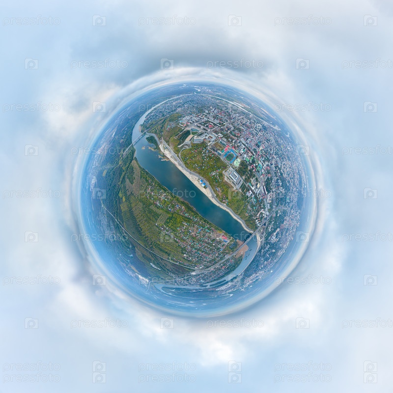 Уфа, Россия. Панорама города с воздуха во время заката. Облачная погода. 360-градусный воздушный панорамный астероид