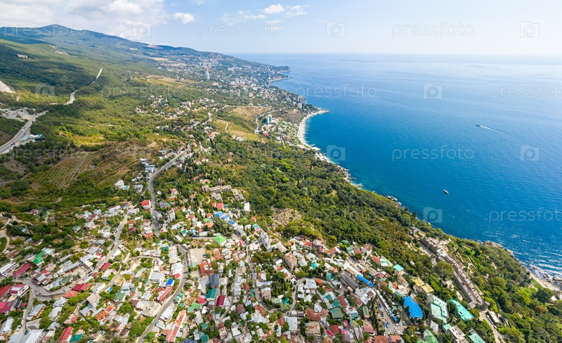Крым, Южное побережье. Деревни на побережье Черного моря в свете яркого солнца