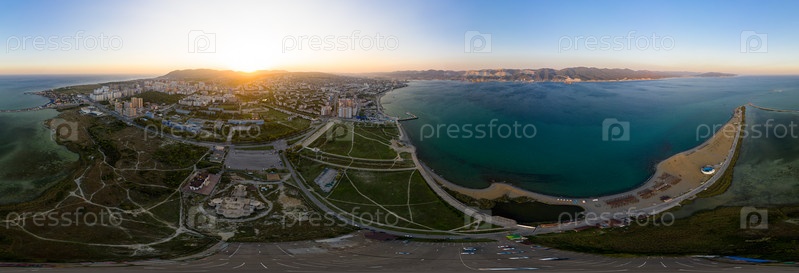 Новороссийск, Россия.Центральная часть города.Суджукская голова.Закат.Паноарма 360.Вид с воздуха