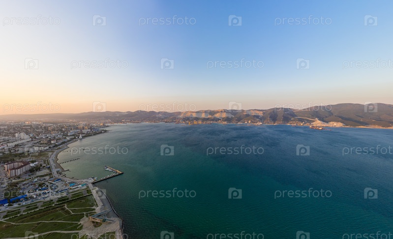 Новороссийск, Россия. Центральная часть города. Порт в Новороссийской бухте. Закат. С высоты птичьего полета
