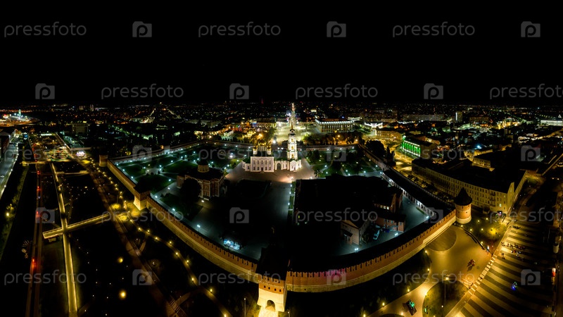 Тула, Россия. Ночная панорама с воздуха. Тульский кремль. Огни большого города