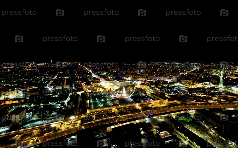 Тула, Россия. Ночная панорама с воздуха. Тульский кремль. Огни большого города
