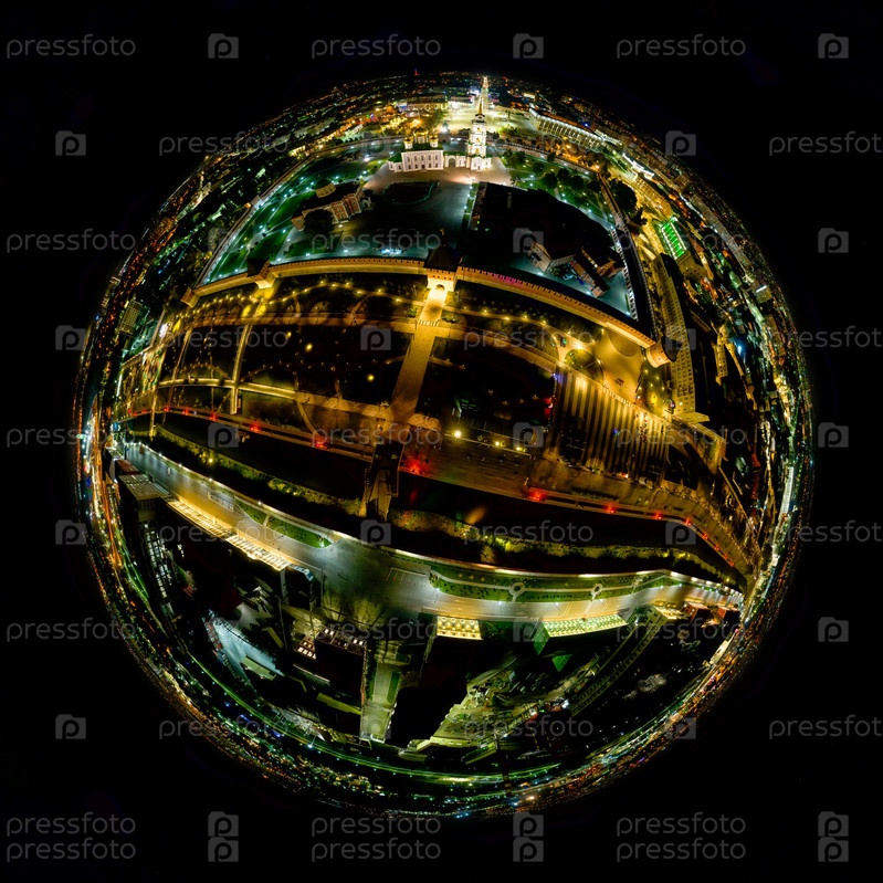 Тула, Россия. Тульский кремль. Ночная панорама Вид с воздуха. Огни большого города. 360-градусный панорамный астероид