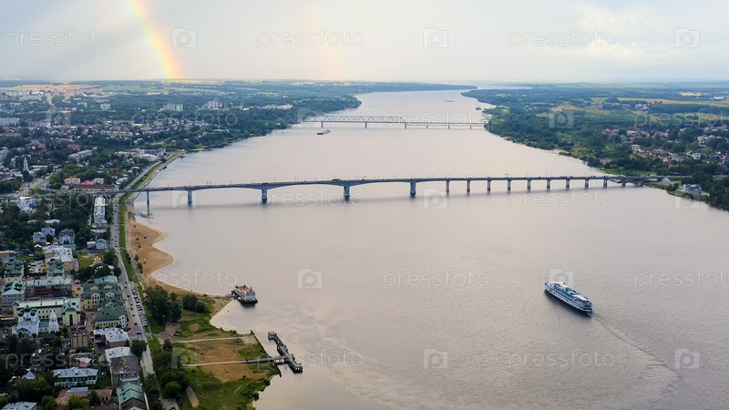 Кострома, Россия. Полет над Волгой. Круизный лайнер плывет по Волге, Радуге, Вид с воздуха