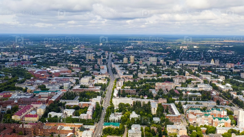 Иваново, Россия. Полет над центром города. Площадь Революции, вид с воздуха