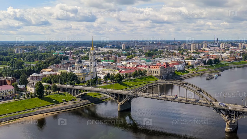 Рыбинск, Россия. Рыбинский мост. Мост через реку Волга, расположенный в городе Рыбинске Ярославской области, вид с воздуха
